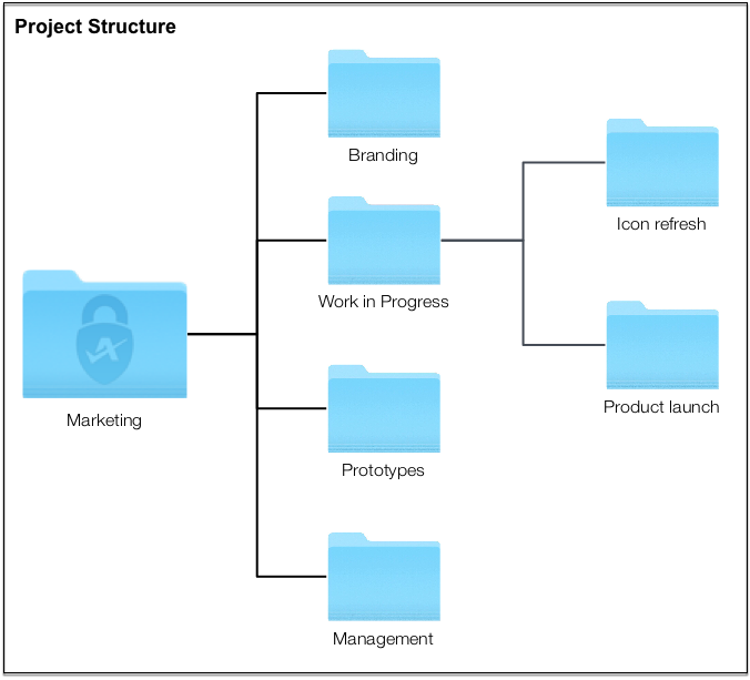 You are the VP of Marketing, and you own a project called Marketing. The Marketing team consists of a manager, a designer, and an intern, all of whom are part of the Marketing group. Within the Marketing project we have four folders - Branding, Work in Progress, Prototypes, and Management.