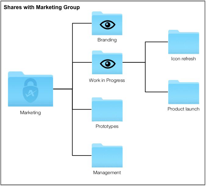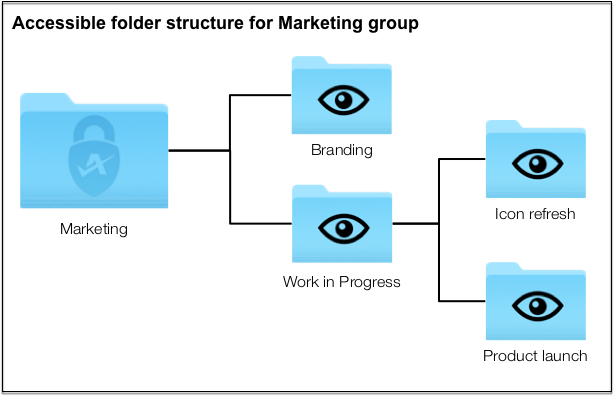 This way, through the mechanism of group sharing within the team, the entire Marketing group (and the intern, who is a member of the group but has not had any direct team shares granted) has Read Only access to the Branding and Work in Progress folders.