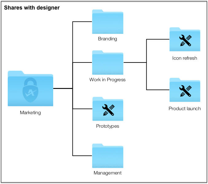 The designer is able to see the Branding folder, because they have Read Only access via the group team share. But they are also able to create and modify files and folders within the Prototypes folder, and selected sub-folders within the Work in Progress folder, because they were granted Create & Modify permissions to those locations through a direct team share with them.