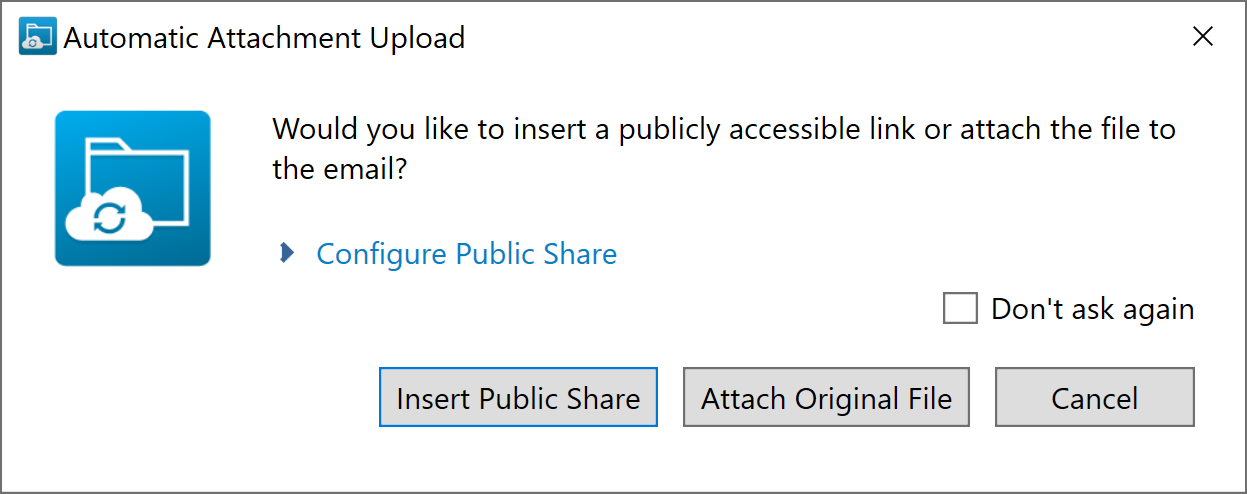 - To use your default public share options/attachment upload preferences, skip to Step 6. To make changes to them for this email only, click Configure Public Share to expand the popup: