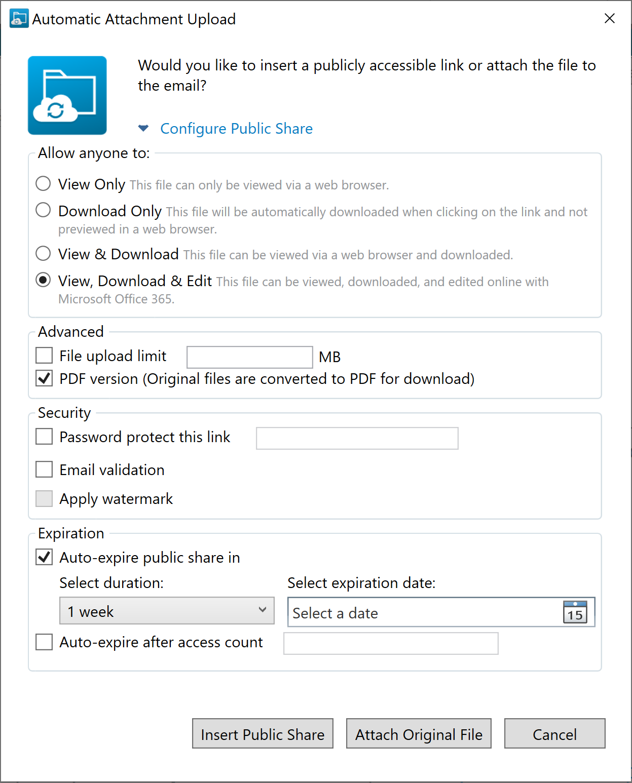 Create Public Share... - this option will create a share accessible to anyone via a public URL and insert the link into the body of the email. The following options are available: