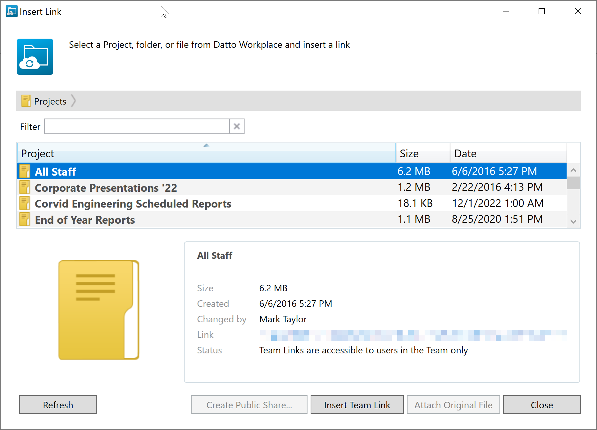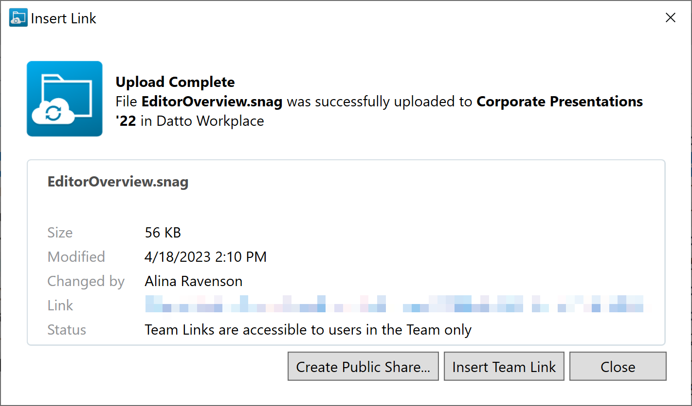 Insert Team Link - this option will insert the link into the body of the email. Team shares are only accessible to users with whom the file is already shared within Workplace.