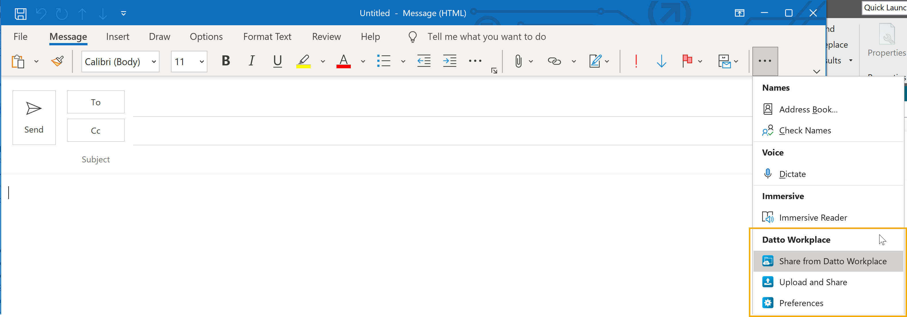 - In Outlook, click New Email. The Workplace Outlook Plugin will be displayed in the ribbon: