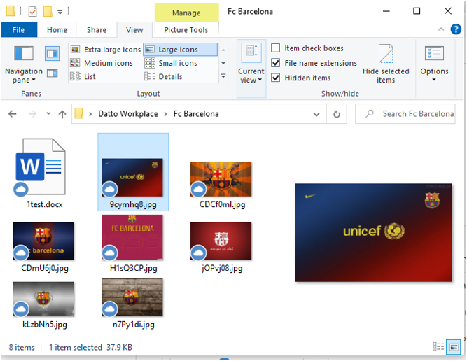 As you may know, you can view file thumbnails for synced files in Windows Explorer. With this release, we've expanded that feature to include files regardless of their sync status. This functionality provides you with a preview of primarily visual files before you open them. Thumbnails are available for the following file types: .ai, .asc, .bmp, .cdr, .dcx, .dgn, .drw, .dwf, .dwg, .dxf, .gfa, .gif, .heic, .ico, .img, .jp2, .jpeg, .jpg, .mif, .odp, .pcd, .pcx, .plt, .png, .pot, .potx, .pps, .ppsx, .ppt, .pptm, .pptx, .psd, .psp, .pub, .stc, .sti, .stw, .sxc, .sxi, .sxw, .tga, .vsd, .vsdx, .wmf, and .wpg.