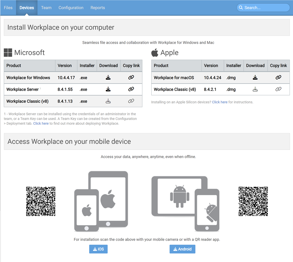 - Click the Install Workplace button in the top right corner of the interface. The Install page will open. This page allows you to download the Workplace app version you need, or copy a download link to send to other users.