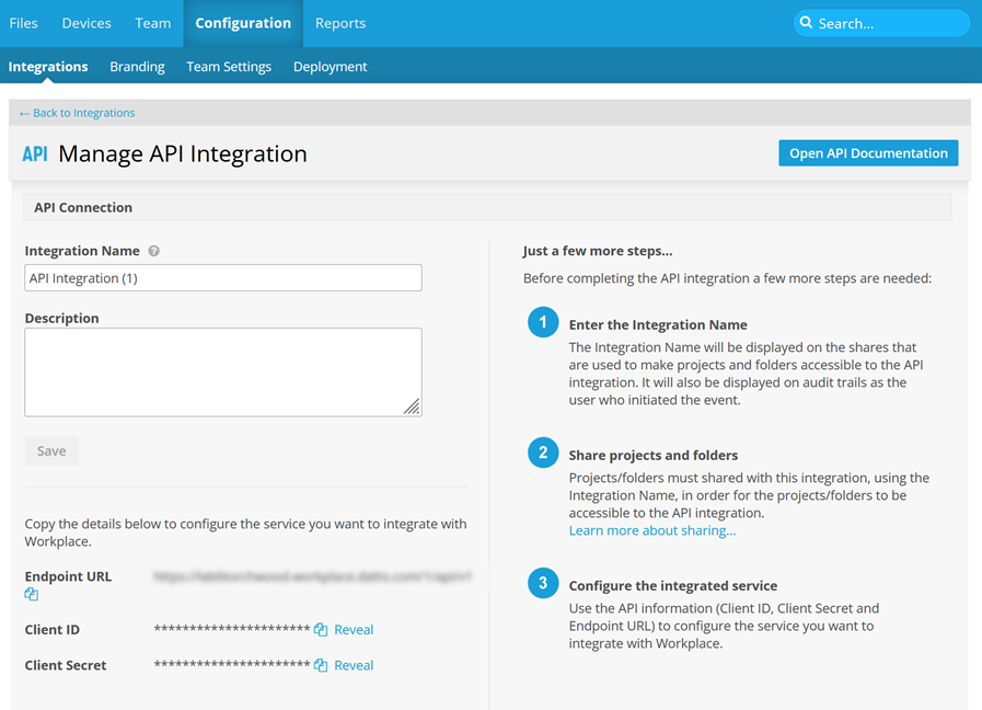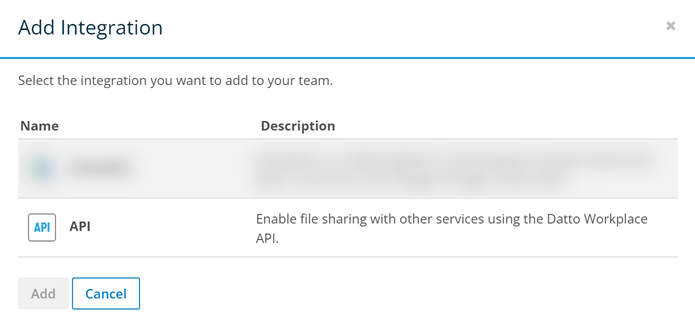 This topic explains how to enable and configure file sharing with other services using the Datto Workplace API. Adding file sharing API integrations to your Workspace team allows you to create seamless integrations with other file management apps. The process for adding an API integration is simple. Comprehensive, interactive guidance can be accessed directly from the Integrations page.