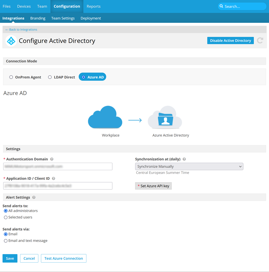 - Go to Configuration > Integrations > Active Directory tile > Manage button > Configure button.