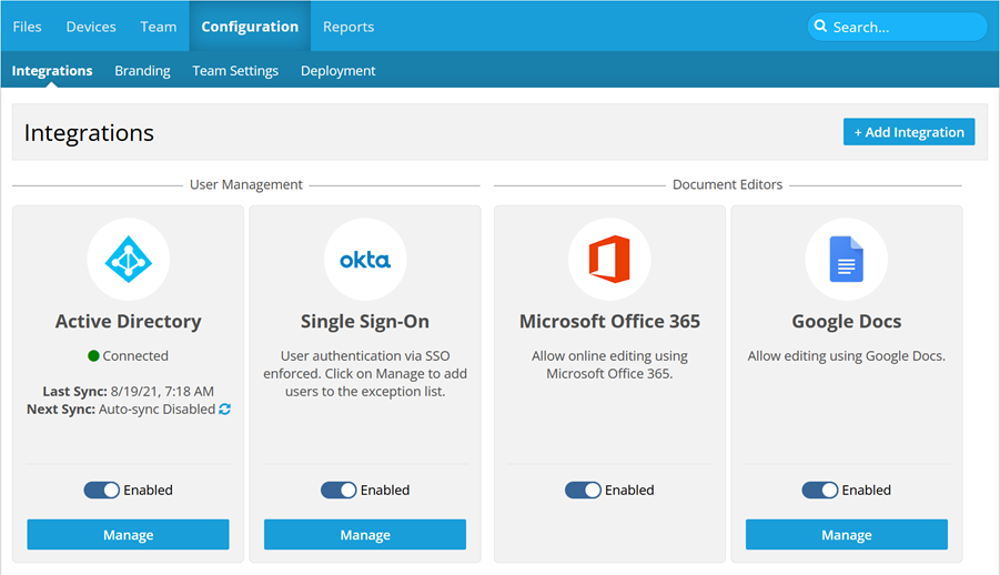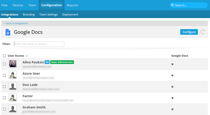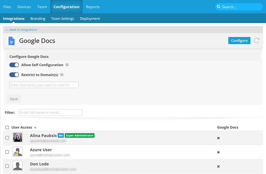 This topic explains how to manage the Google Docs integration for your team.