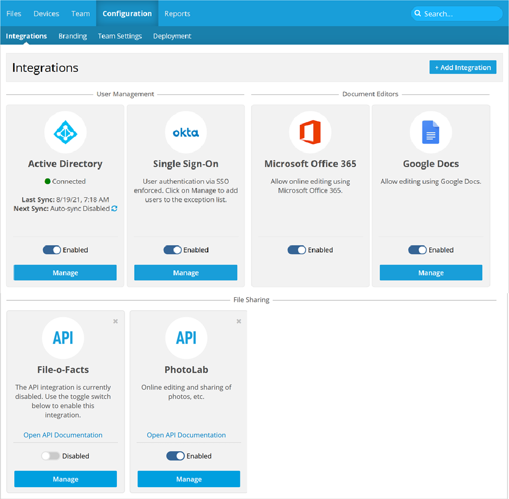 This page allows you to manage all your integrations in one place. This includes your Active Directory and Single Sign-On integrations as well as the document editors available to your users. You can also add API integrations in the File Sharing section.