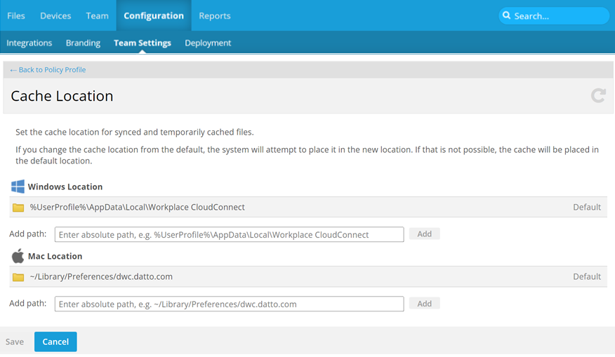 Once the Workplace v10 Storage Settings policy is added to a policy profile, a Manage link appears next to the policy. Click it to designate the location for synced and temporarily stored files on the Cache Location page: