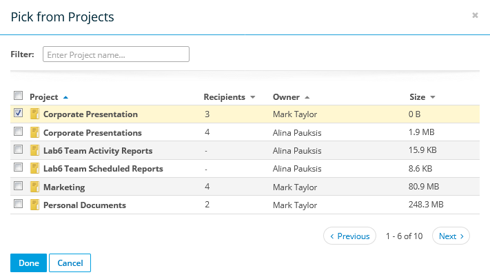 - To choose or omit an entire project, select or clear the corresponding check box.