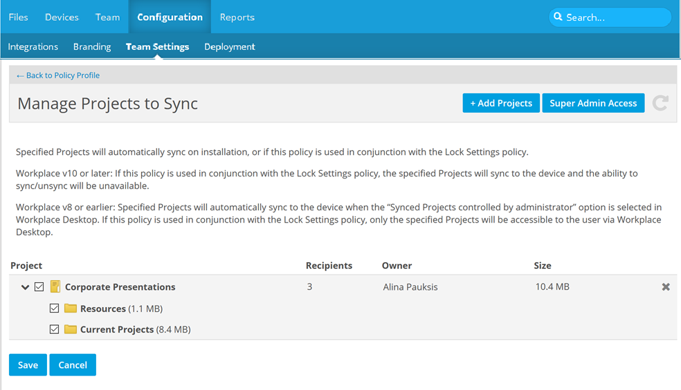 In Workplace v8 or earlier, the projects specified on this page will automatically sync to the device when the Synced Projects controlled by administrator option is selected in Workplace Desktop. If this policy is used in conjunction with the Lock Settings policy, only the specified projects will be accessible to the user via Workplace Desktop.