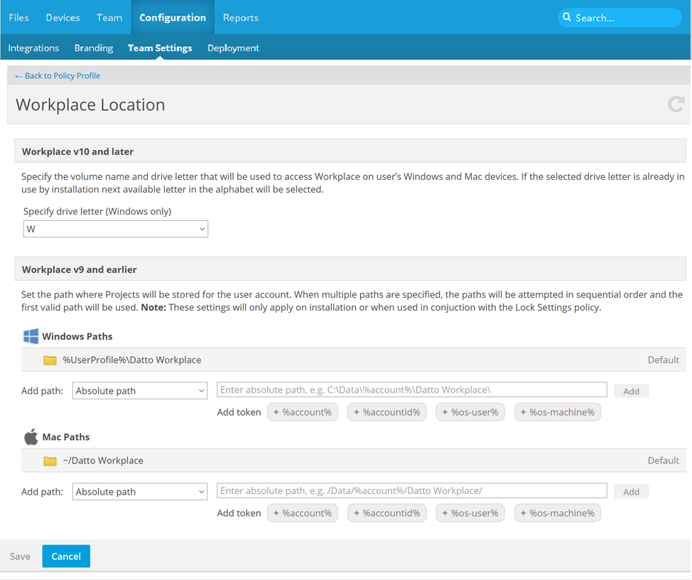- Tokens such as OS user name, OS computer name, Datto Workplace UserID, etc., can be used to specify variables in the path(s).