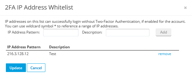 After you enable the 2FA policy and save, a Manage link will appear next to this setting. Click the Manage link, which will open this popup window: TIP Wildcards are implemented in a very simple way. Just use one or more asterisks in the pattern. An asterisk will replace 0 or more characters