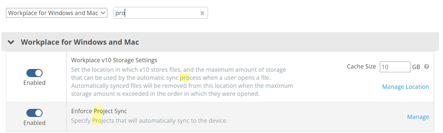 Specify projects or folders that will automatically sync to the device. If this policy is enabled, the Project list controlled by administrator check box on the Workplace Desktop Sync tab will be selected by default upon installation, but users may clear the check box to customize the projects they wish to sync. If they select the check box again, only projects designated in this policy will be synced. |