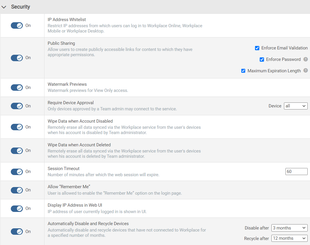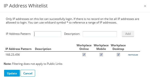 | IP Address Whitelist | Restricts log in via a web browser, Workplace Mobile or Workplace Desktop to specified IP addresses. |