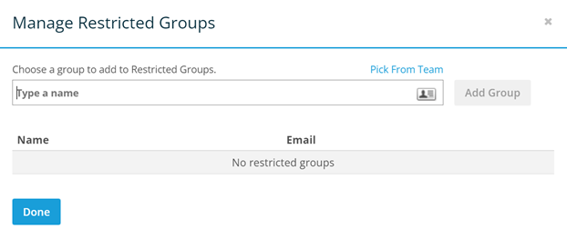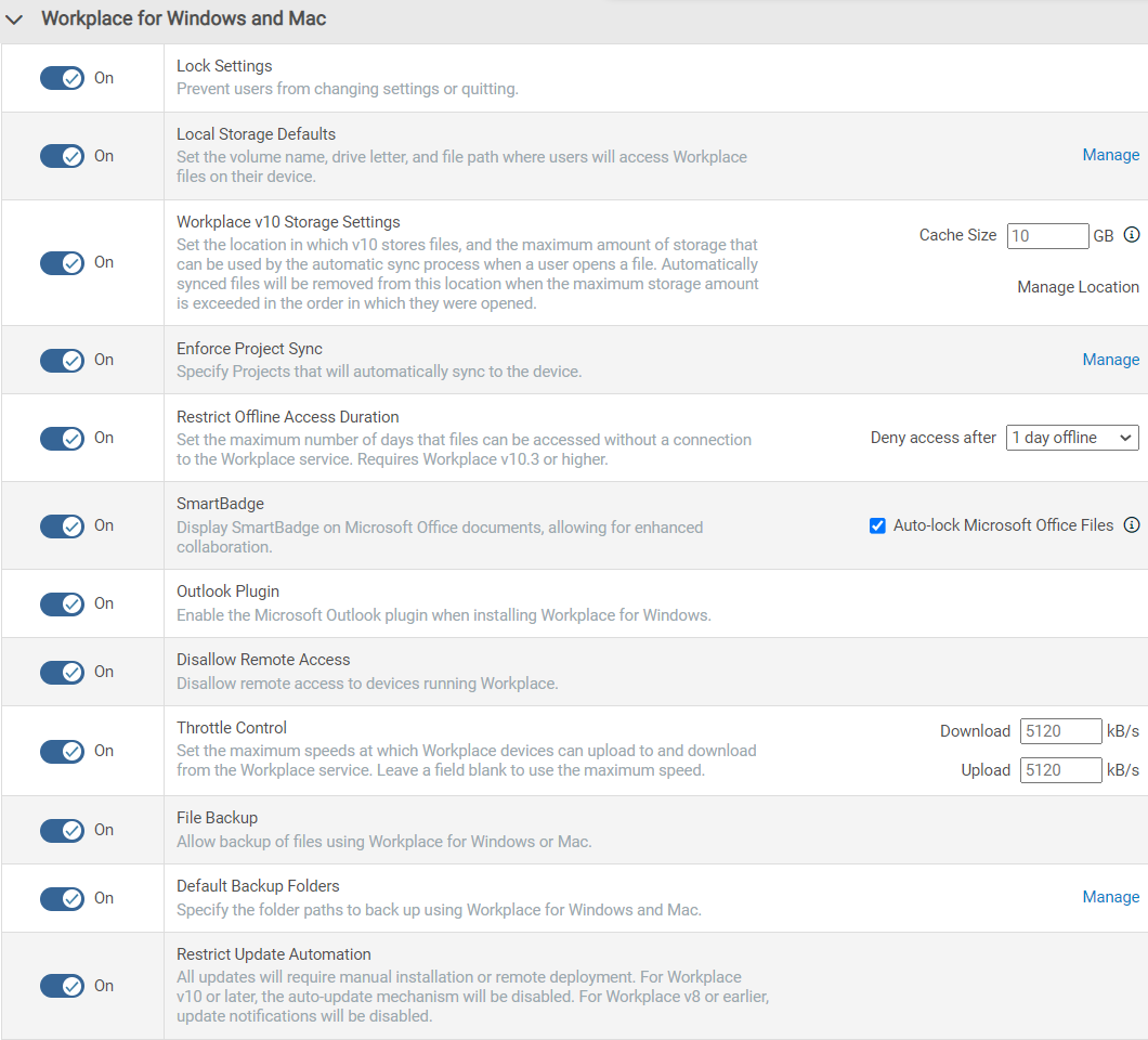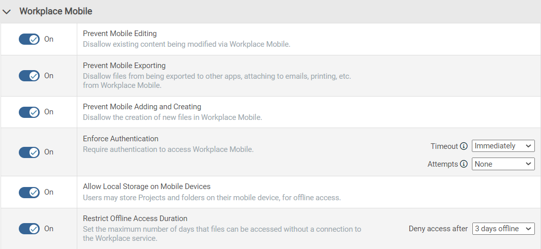| Restrict Offline Access Duration | Sets the maximum number of days that files can be accessed without a connection to the Workplace service. Requires Workplace v10.3 or higher. | Toggle the switch to On, then select a time period from the Deny access after dropdown. |