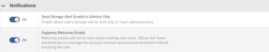 Emails about user quotas will be sent only to team administrators. For more information, refer to Manage team storage. | Toggle the switch to On. |