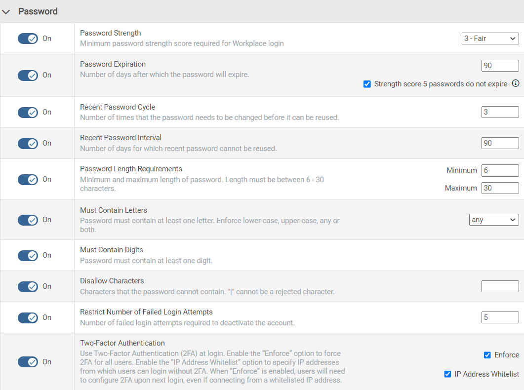 | Password Strength | Minimum strength required when users create their passwords. | Toggle the switch to On, then select a minimum password strength. |