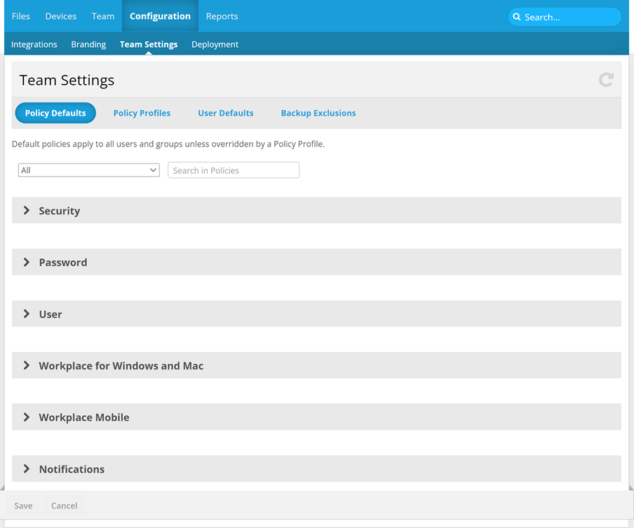Policies control all the configurable behaviors and features in Workplace. Policy defaults, which you control on this page, are applied to all users and groups unless overridden by a policy profile.