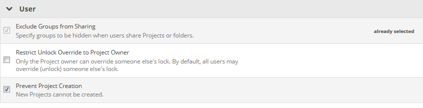 | Prevent Project Creation | Users or groups or users to whom this policy is applied will not be able to create new projects. | Select the check box. |