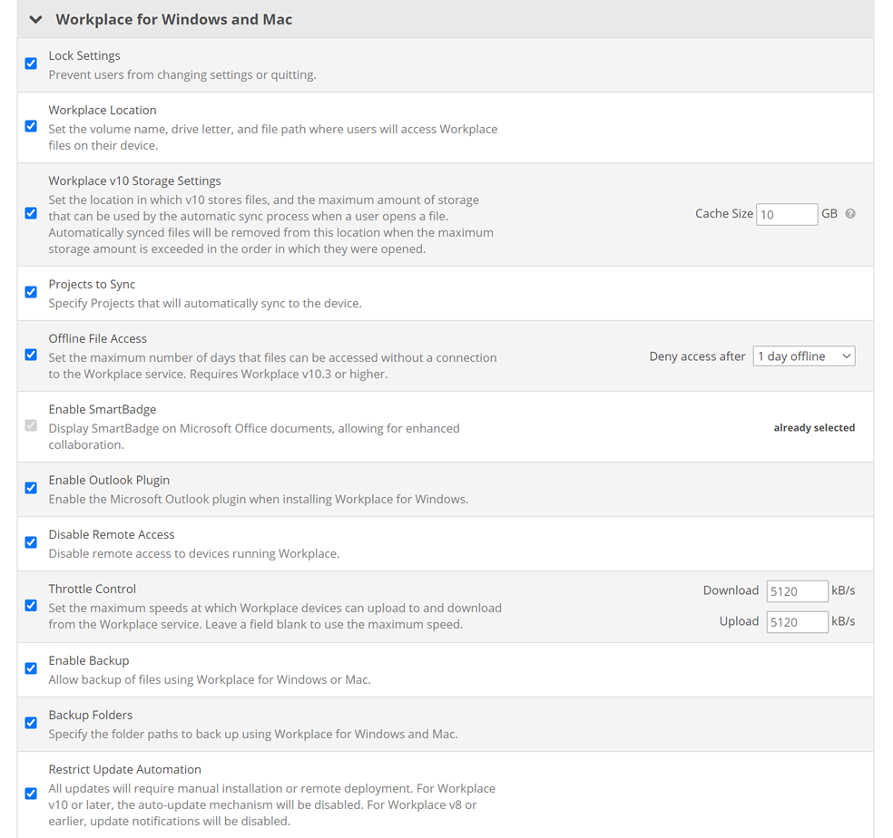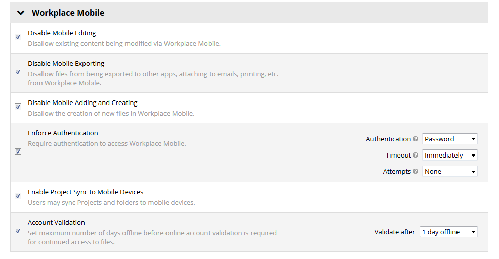 | Restrict Offline Access Duration | Sets the maximum number of days that files can be accessed without a connection to the Workplace service. Requires Workplace v10.3 or higher. | Select the check box, then select a time period from the Deny access after dropdown. |