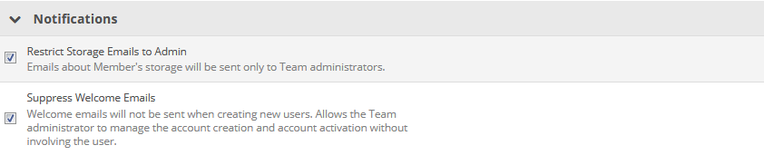 Emails about user quotas will be sent only to team administrators. For more information, refer to Manage team storage. | Select check box. |