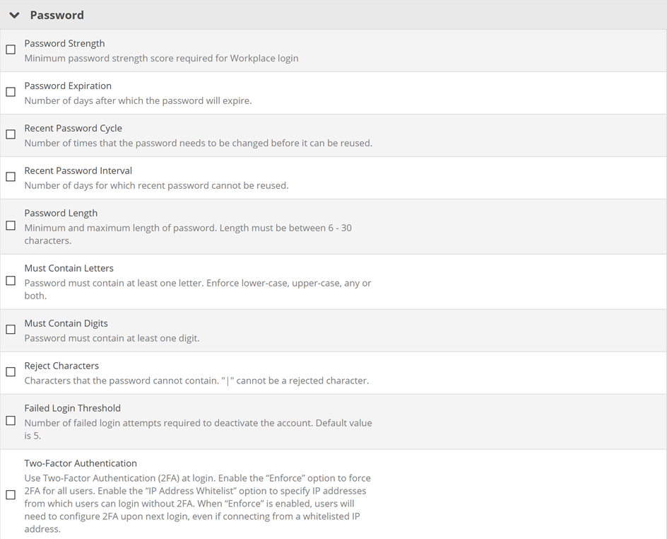 | IP Address Whitelist | Restricts log in via a web browser, Workplace Mobile or Workplace Desktop to specified IP addresses. |