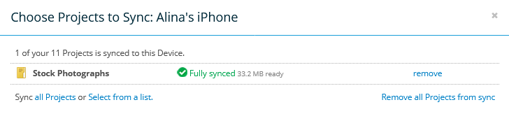 To remove all projects from sync, click the Remove all Projects from sync link, then click OK in the confirmation popup window.