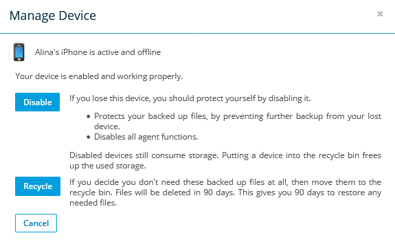 NOTE Files will be deleted from recycled devices in 90 days. You can restore any necessary files during this period.