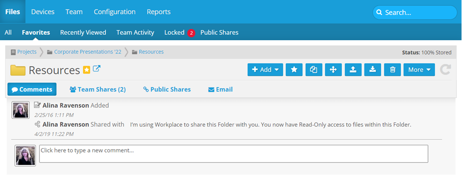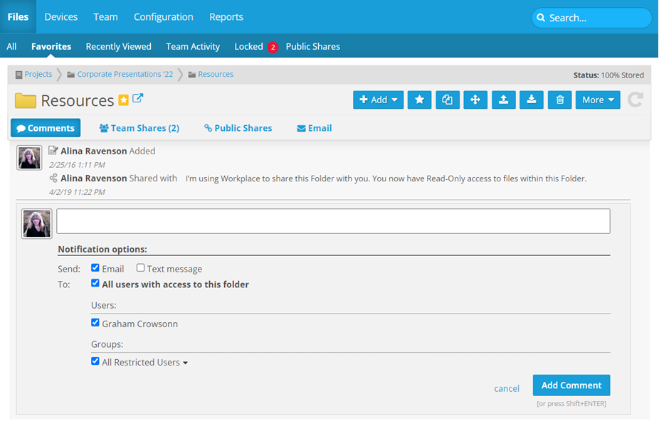 A comment is a note that can be added to a project, folder, or file by a user, or by the system. Comments are a useful collaboration tool that provide a clear overview of conversation and events relating to the project, folder or file with which they are associated.