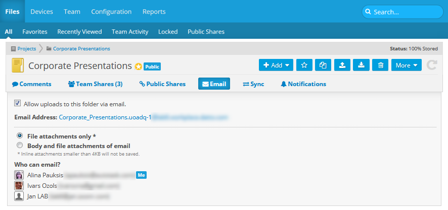 PERMISSIONS Email uploads to a project or folder require that the email address from which the mail is sent is associated with a user who has Create and Modify or Full Access permissions to the files