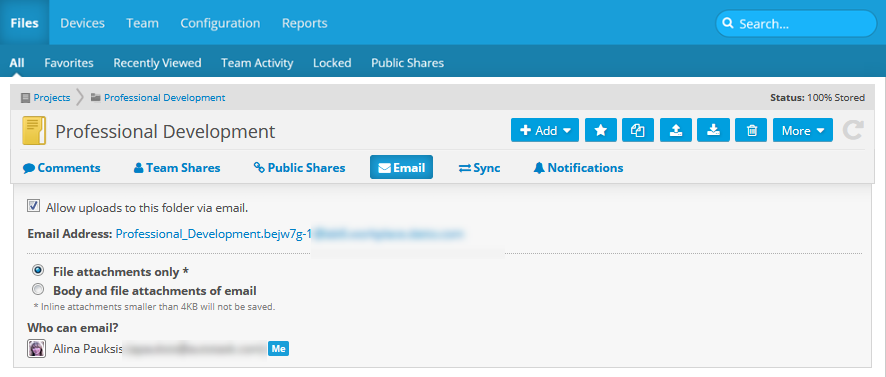 - Select the Allow uploads to this folder via email check box. An email address will be generated and displayed.