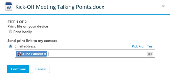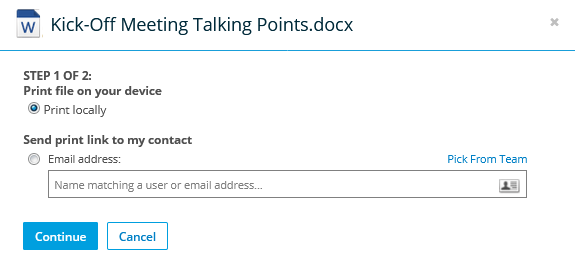 When you print a file from within Workplace Online, you have the option of either printing the file locally, or sending a print link to a user or other email address(es).