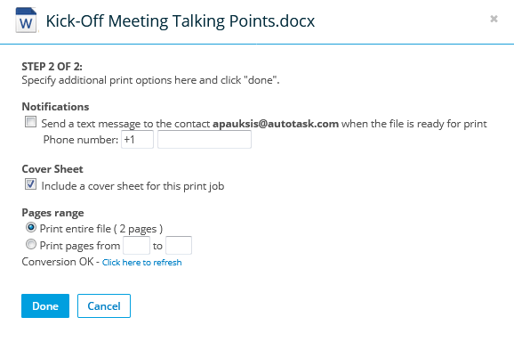 - Optionally, select the Send a Text message to the contact when the file is ready for print check box and add a phone number.