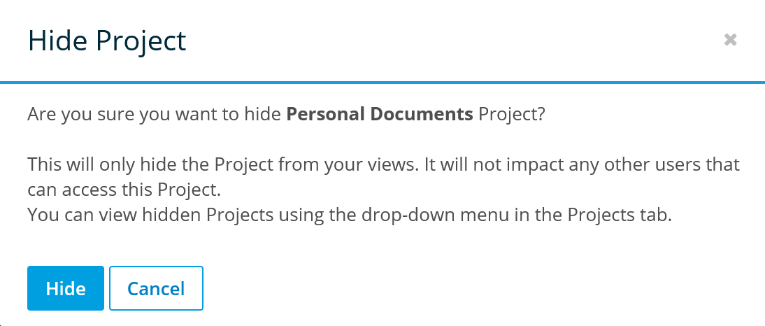 | Manage > Hide | Hide the project. This will open the Hide Project popup:![]() To confirm, click Hide. Hidden projects are not deleted; they are just hidden from your views. Hiding a project only hides it for you. It will still be visible to other users. You can display hidden projects using the dropdown menu in the All Projects. |