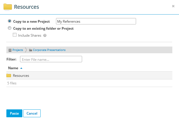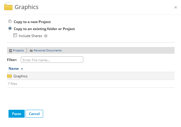 Copy the folder to a different location or to a new project. Depending on your project access levels, you may have the option to copy the folder shares as well as the contents of the folder in the Copy Folder popup window: PERMISSIONS You may only copy folder shares if you are the project owner or have full access to the project and reshare permissions for both the original project and the project you are copying the folder to. |