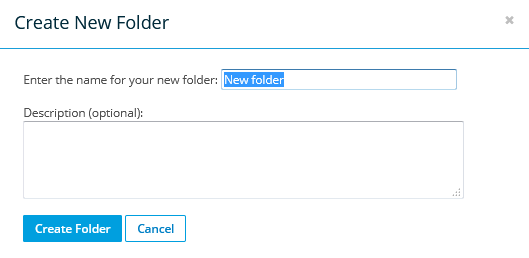 | Add | Add Folder | Add a sub-folder. This will open the Create New Folder popup window:![]() Enter the folder name and optionally add a description, then click Create Folder. |