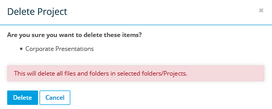 Delete the entire project and all files and folders in the project. This will open the Delete Project popup:![]() Confirm your action in the Delete Project popup. BEFORE YOU DELETE a project, please read Deleting and undeleting. |
