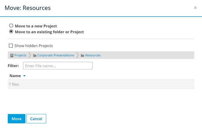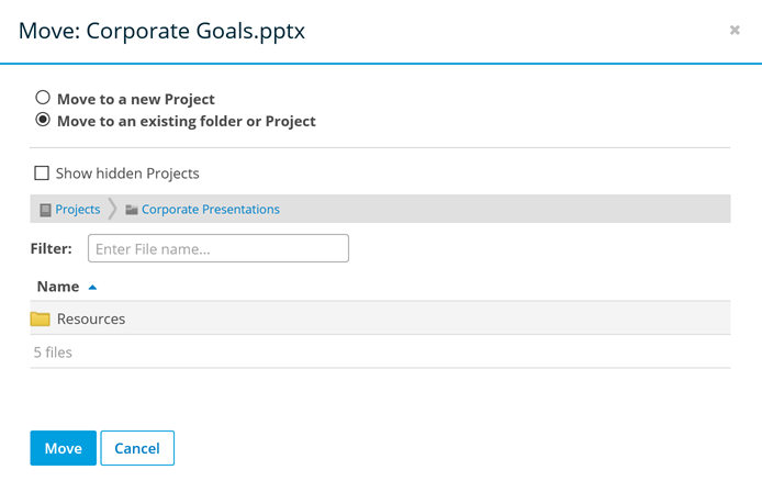 Move the file to a different location or to a new project. This will open the Move File popup window: If you wish to move the item to a hidden project, select the Show hidden projects check box. To move to a new project, select the appropriate check box, enter the name of the new project, then click Move. |