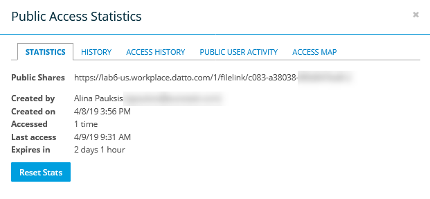 Opens the Public Access Statistics popup: The popup displays statistics, history, access history, public user activity, and an access map. Click a tab title to change the statistics view. |