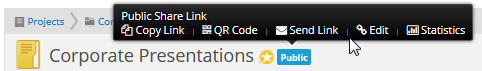 | Public Share This option is available to project owners and if Reshare permissions were granted when the project was shared with you unless restricted by Policy Profiles |