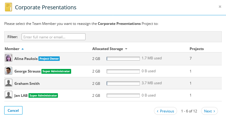 | Manage > Reassign | Reassign the project to another user. This will open the Reassign Project popup:![]() Select the resource, optionally select the Grant Full Access & Reshare permissions to old owner when reassigning the project check box, then click Reassign Project. |