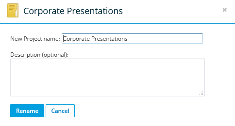 Manage > Rename | Rename the project. This will open the Rename Project popup:![]() Edit the project name, optionally update the description, then click Rename. |