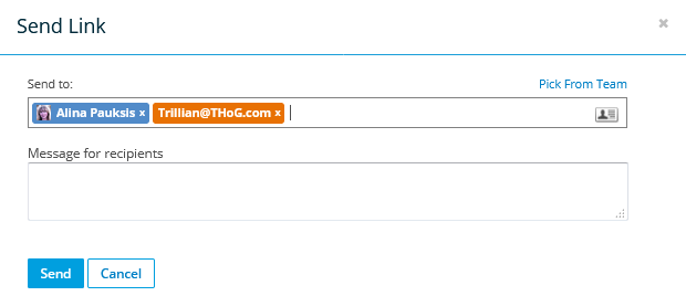 Email the file to one or more recipients. This will open the Send File popup window:![]() Begin typing a name or email address or click the Pick From Team link or the Optionally, add a message, then click Send. |