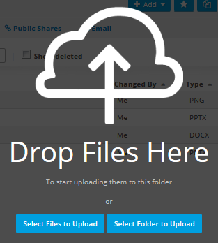 | Upload | Upload a file to this folder. ![]() Just drag and drop a file into the cloud image or click Select Files to Upload to browse for a file. Refer to Uploading items to Workplace Online. |