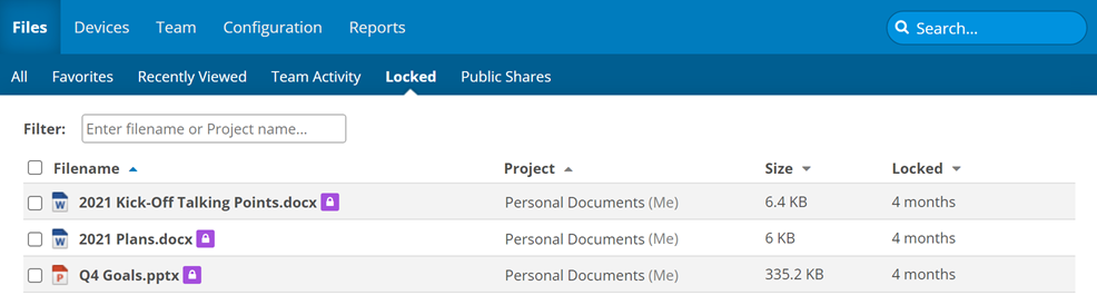 Files can be locked Workplace to prevent users from overwriting each others' work. These locked files are displayed on the Locked view of your Files area.