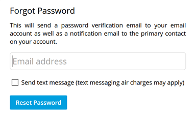- Click Reset Password. This will send a password verification email to your email account as well as a notification email to the primary contact on your account.