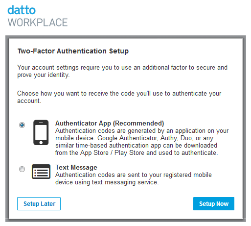 IMPORTANT Authenticator App is the setting we recommend. Google Authenticator, Authy, Duo, or any similar time-based authentication app can be downloaded from the App Store / Play Store and used to authenticate.