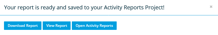 - When the report has been generated, it will automatically be saved to a project called Activity Reports, and the following popup will display: